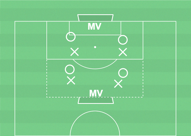 I den här spelträningen spelar lagen 4 mot 4 med målvakter.