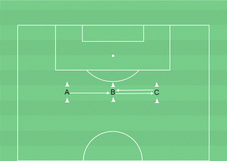 3 barn, 3 konmål 10–15 m mellan de yttre målen och bollar.