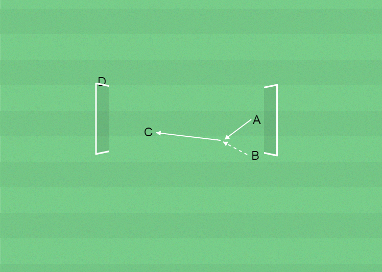 B följer bollen och måste avsluta innan bollen passerar mittlinjen.