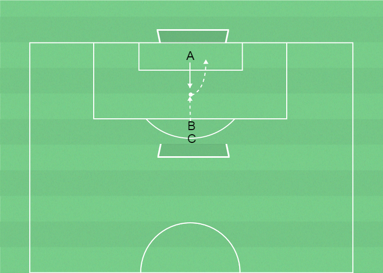 3 målvakter, 2 mål avstånd 10–15 m och 2 bollar.