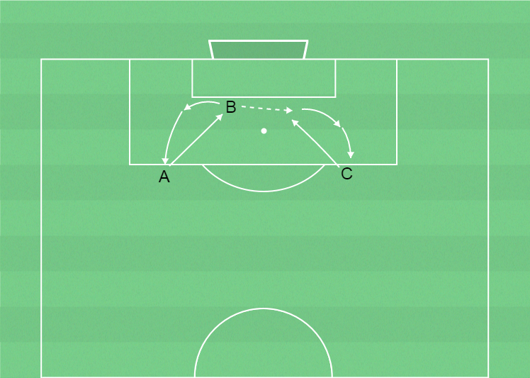 Som ett alternativ kan A passa till B som vänder spelet till C.