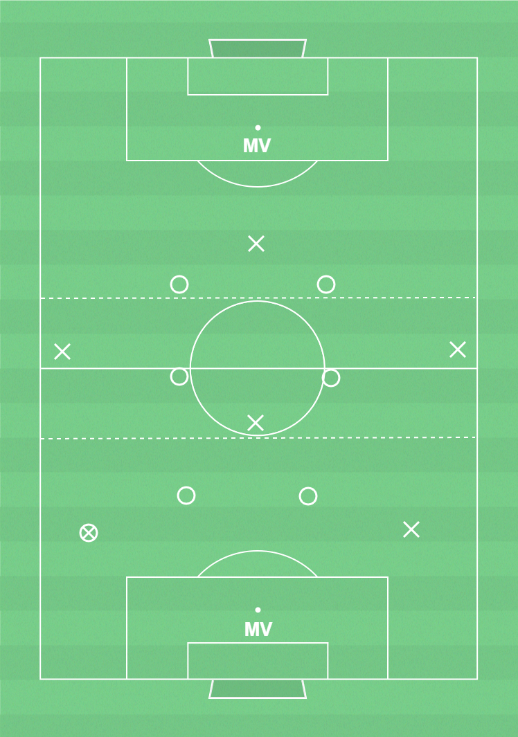 14 spelare, yta 50-55x30-35m (7 mot 7 plan), bollar, 2 färger västar, 2 mål.