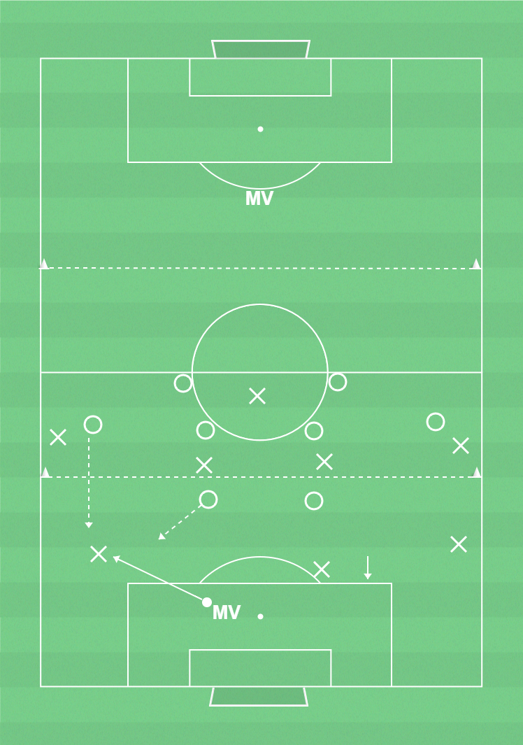 Försvarande lag startar pressen i den centrala tredjedelen. Anfallande lag ska försöka spela in bollen i den sista tredjedelen.