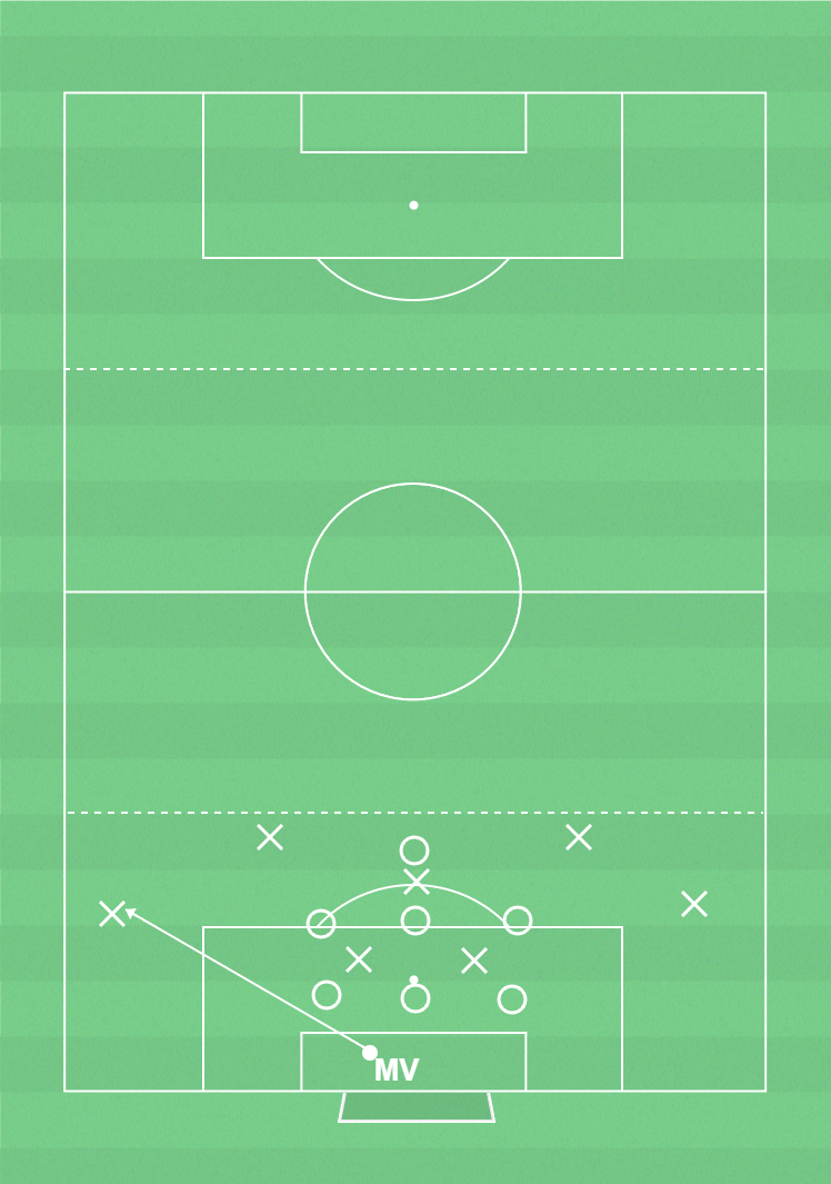 Lag 1 börjar i anfall och lag 2 i försvar. Lika många i varje lag men lag 2 har även en MV. Formation enligt lagets spelsystem. Alla spelare i sista 1/3.