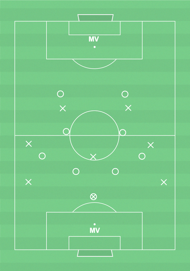 18 spelare, yta 65-72x50-55m (9 mot 9 plan), bollar, 2 färger västar, 2 mål