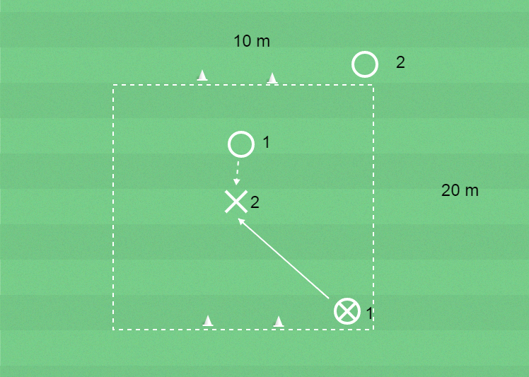 4 spelare, yta 20 x 10 meter, bollar, koner och västar.