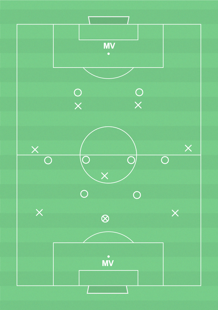 Spel med 9 mot 9 regler. Starta alltid spelet med alla utespelare i central 1/3.