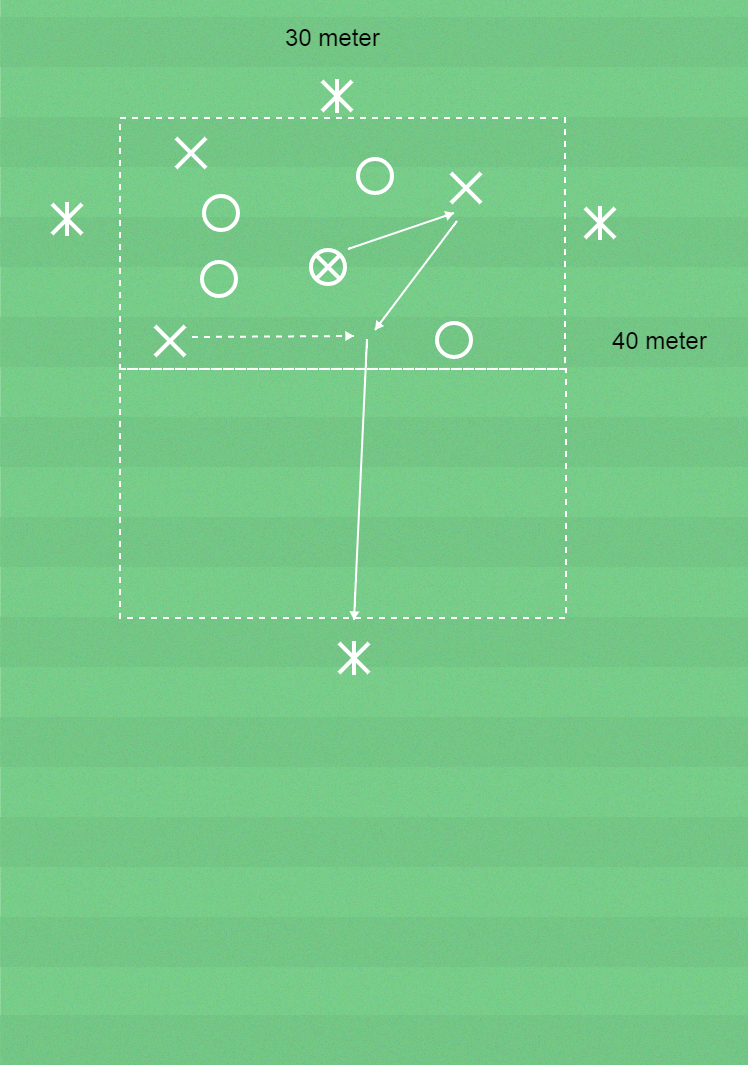 Dela spelytan i 2 delar om vardera 20 x 30 meter. Spel 4 mot 4 i den ena ytan plus 3 väggar som spelar med det bollhållande laget.