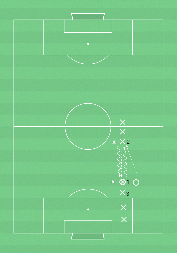 X1 driver bollen med maximal hastighet mot X2 samtidigt som O löper vid sidan om och försöker komma i kapp X1.