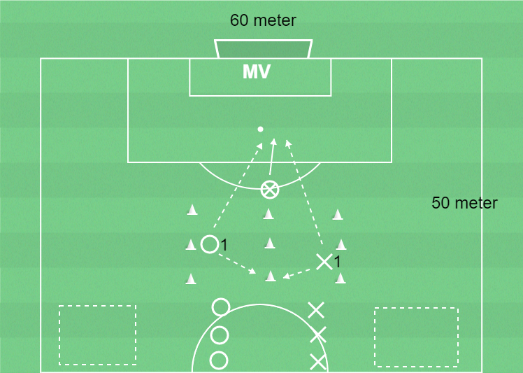 Bollhållaren passar då en boll till X1 som avslutar.