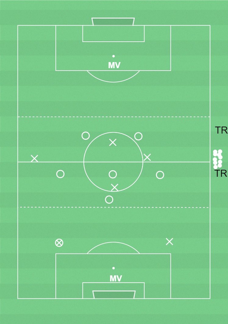 2) Forward styr mot ena kanten och laget gör överflyttning mot bollsida.