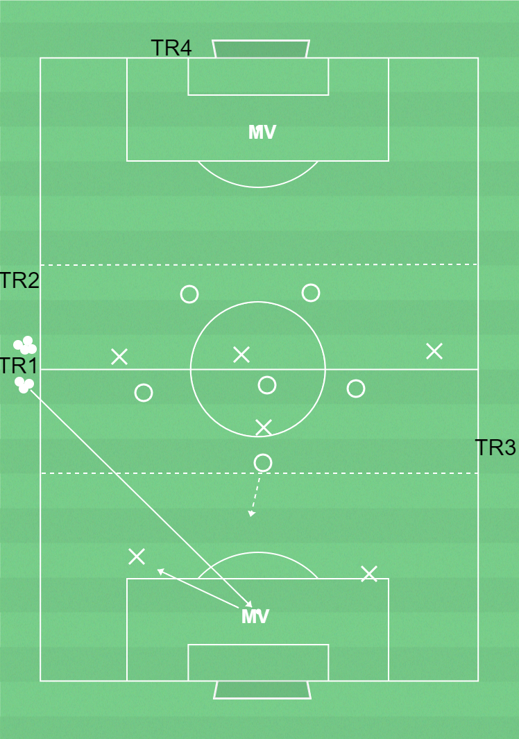 Spelet startar alltid genom en passning till målvakten i anfallande laget, eller ett inkast, från den första tredjedelen. Låt lagen hitta sin formation innan spelet startar. När MV startar spelet får laget som börjar i försvarsspel endast försvara med en spelare i motståndarnas första tredjedel. De övriga spelarna samarbetar i den centrala tredjedelen. Om det försvarande laget erövrar bollen övergår övningen i fritt spel.