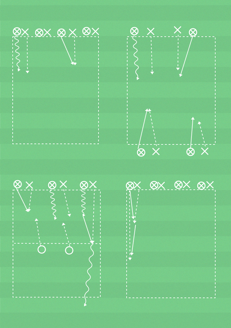 2 och 2 med en boll på ena kortsidan. Paren ska ta sig över till andra kortsidan med bollen på valfritt sett.