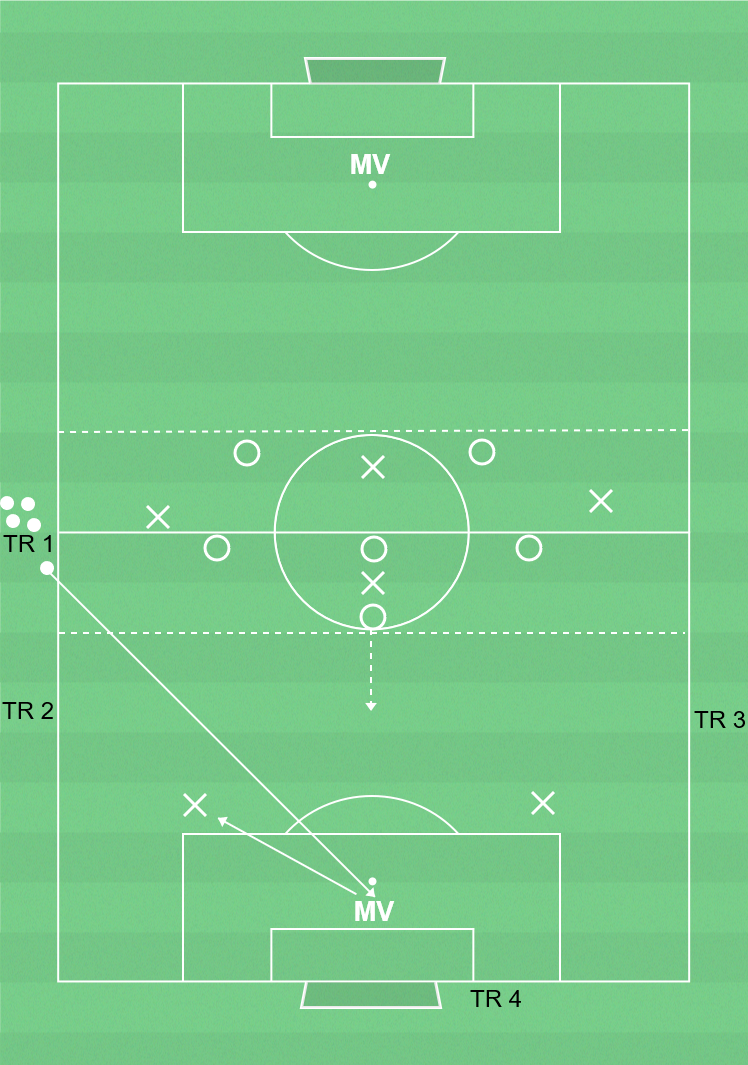 Spelet startar alltid genom en passning till målvakten i anfallande laget, eller ett inkast, från den första tredjedelen. Låt lagen hitta sin formation innan spelet startar. När MV startar spelet får laget som börjar i försvarsspel endast försvara med en spelare i motståndarnas första tredjedel. De övriga spelarna samarbetar i den centrala tredjedelen. Om det försvarande laget erövrar bollen övergår övningen i fritt spel.