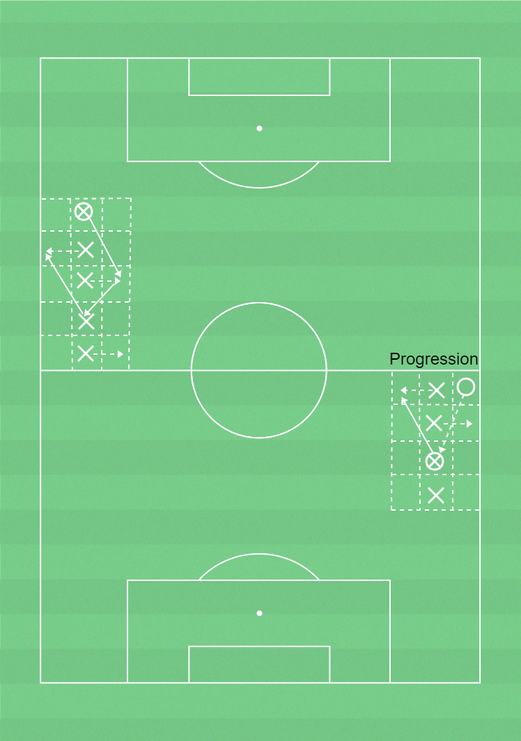 En försvarare kommer till i övningen och har som uppgift att bryta och driva bollen ut ur spelytan i djupled. Laget som förlorat bollen ställer då om till återerövring.