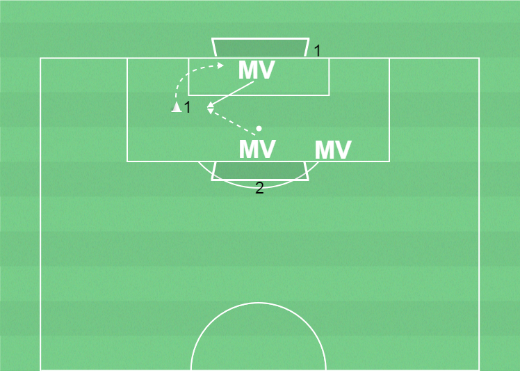 Mv1 rör sig mot bollen, hoppar upp och fångar bollen. Mv1 jobbar till mål 2.