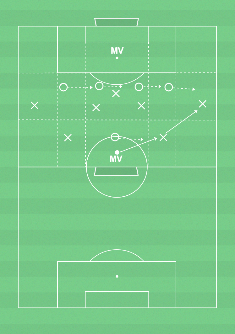 Ytan är indelad i korridorer i sidled och 3 zoner i djupled. Spelarna får bara vara i sin zon. Det anfallande laget är numerärt överläge i de första 2 zonerna. I sista zonen är bara en MV. Anfallande lag måste använda minst 2 tillslag och måste spela bollen igenom mittzonen till den sista zonen innan de får gå på avslut. När bollen spelas till sista zonen övergår övningen i fritt spel. Vid brytning sker omställning till kontring och återerövring och övningen övergår i fritt spel.