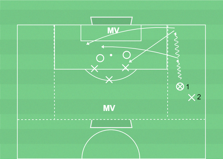 X1 driver bollen i en av de yttre korridorerna. X1 kan välja tre alternativ: tidigt inlägg mot spelyta 3, sent inlägg i luften mot spelyta 2 eller sent inlägg längs marken, cut back. Om det försvarande laget erövrar bollen har man en möjlighet till omställning i den centrala korridoren och i de inre korridorerna. Om lag X återerövrar boll spelas bollen ut till X2 och övningen upprepas. Byt målvakt/kör övningen från motsatt yttre korridor.