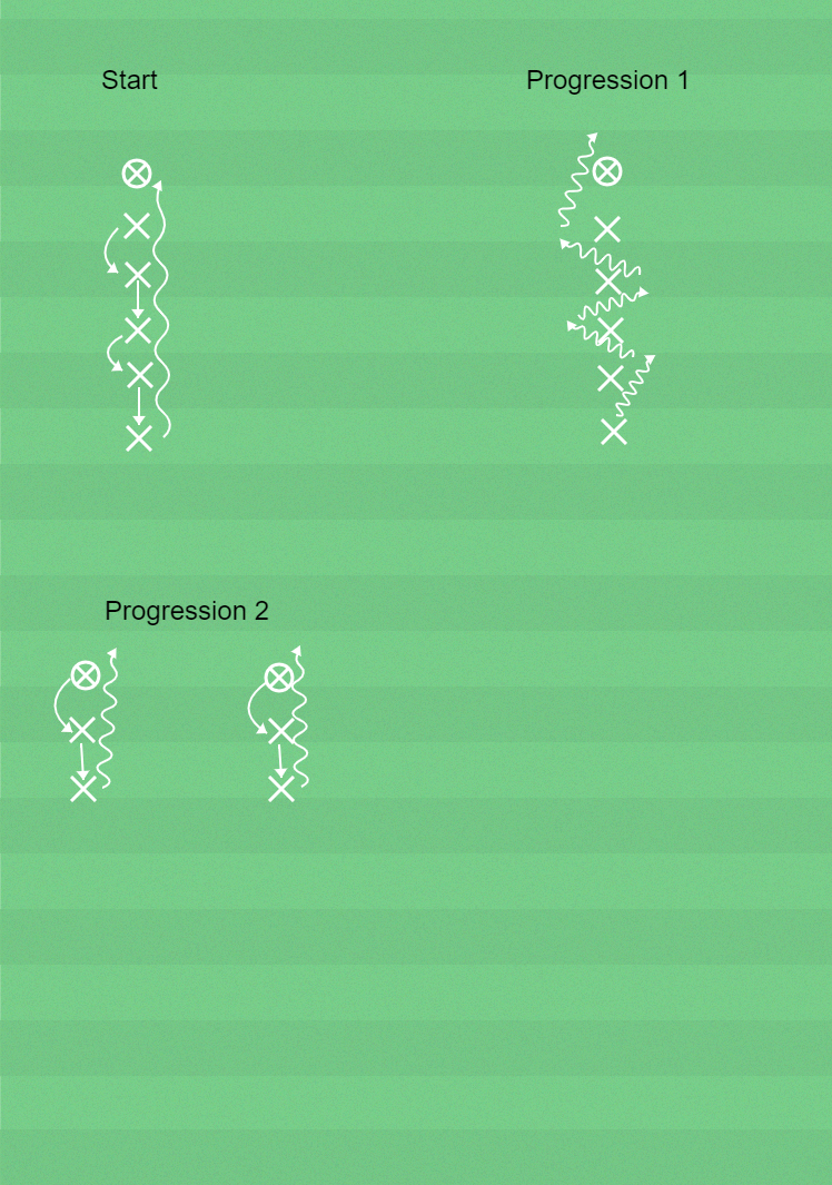 Uppgiften transportera bollen genom ett led så fort som möjligt. Spelarna står på ett led där den första spelaren har en boll i händerna. Bollens ska transporteras genom ledet genom att varannan spelare lämnar över den över huvudet och varnann mellan benen. Den sista spelaren springer fram med bollen och ställer sig först. Upprepa tills spelarna återgått till sina utgångsplatser. Genomför övningen på tid och uppmuntra spelarna att slå sin egen tid.