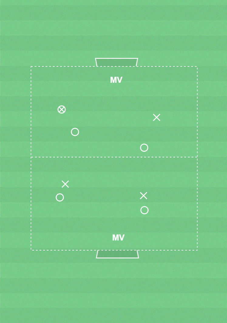 Spelare, bollar, yta 30x15-20m, mål, västar.