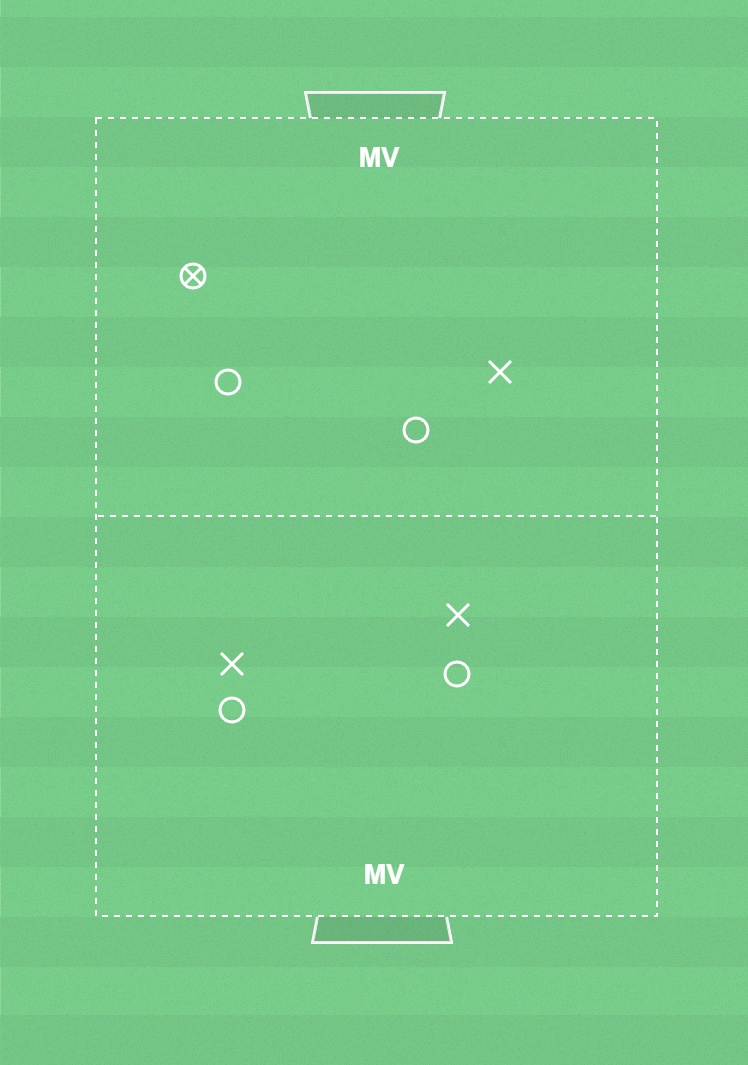 Spelare, bollar, yta 30x15-20m, mål, västar.