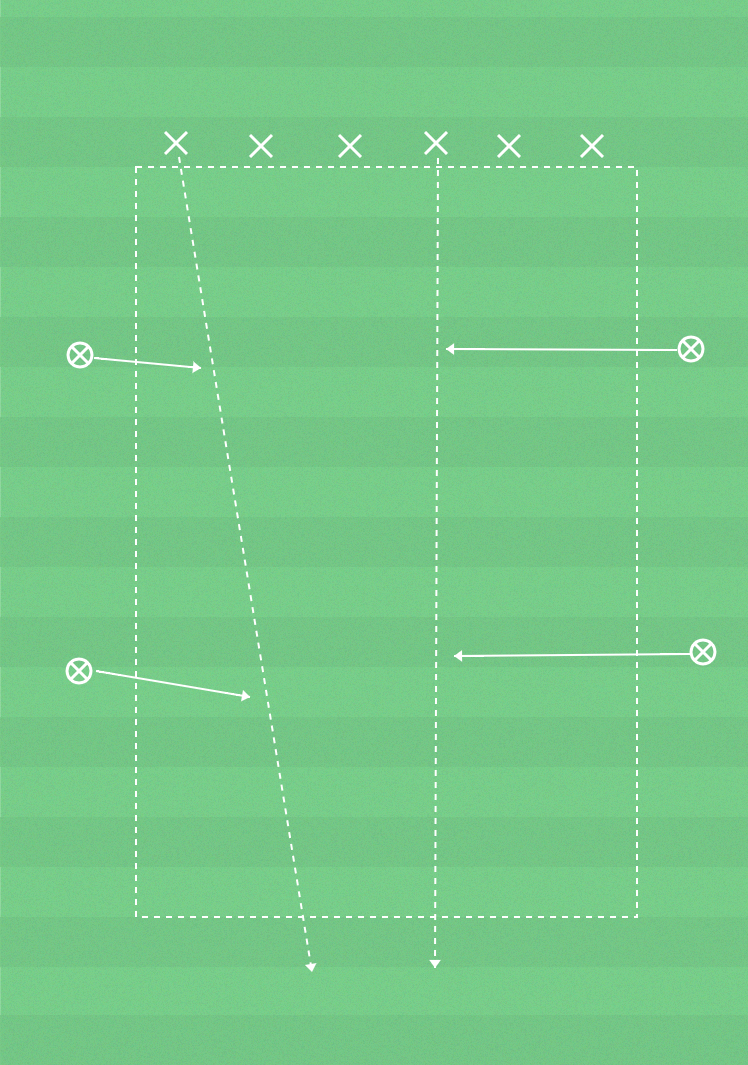 Alla spelare på ena kortsidan. Ledare med bollar längs med långsidorna. På signal ska spelarna springa över till den andra kortsidan utan att bli träffad av bollarna. Ledarna försöker pricka spelarna när de springer över. Ledarna får bara använda bredsidan och träff räknas bara från knät och neråt.