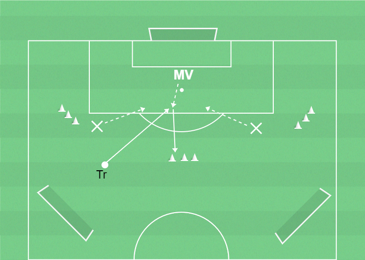 Tr passar bollen mot MV. Två anfallare pressar MV som försöker passa bollen så att de träffar konor som är "fria" eller slå en längre passning i luften i något av målen på planen. Anfallarna varierar mellan att pressa tillsammans och att pressa från olika håll.
