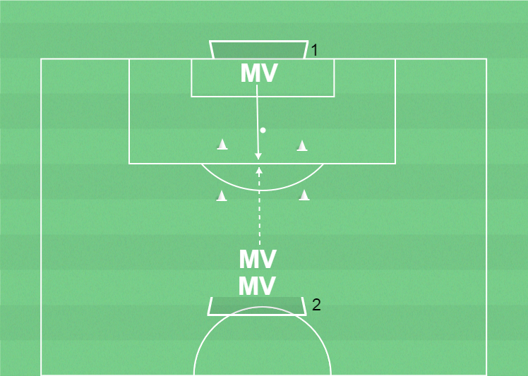 Mv2 lämnar bollen till Mv3 och går själv till mål 1.