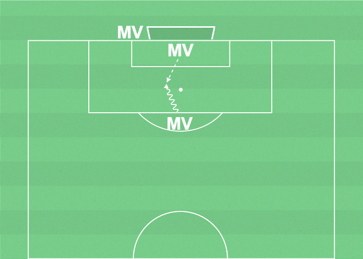 Mv1 driver bollen mot mål och försöker dribbla förbi Mv2.