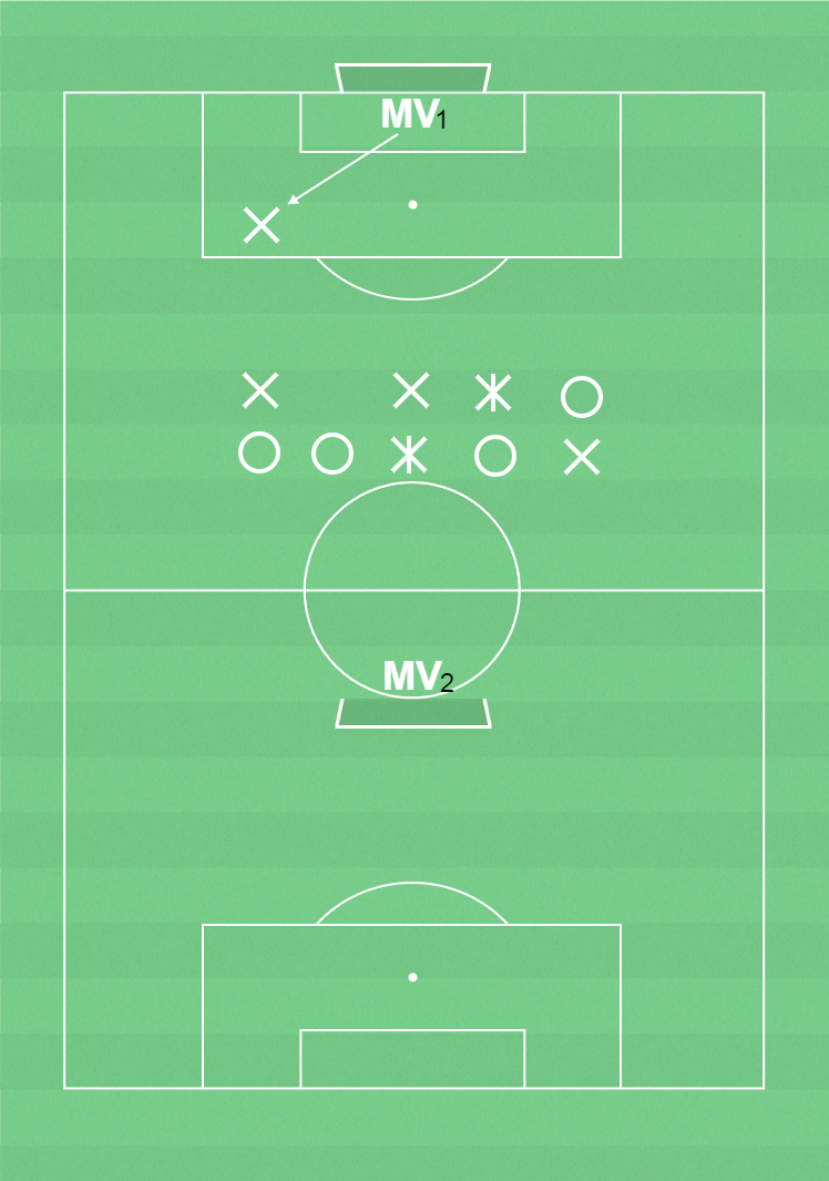 Mv1 rullar ut bollen till en medspelare i försvarszonen.