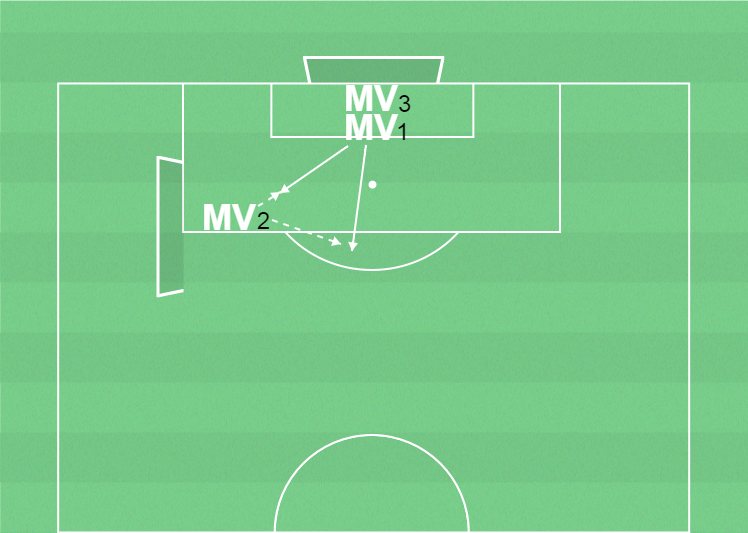 Mv1 kastar eller spelar en hög boll mot Mv2:s bortre stolpe.