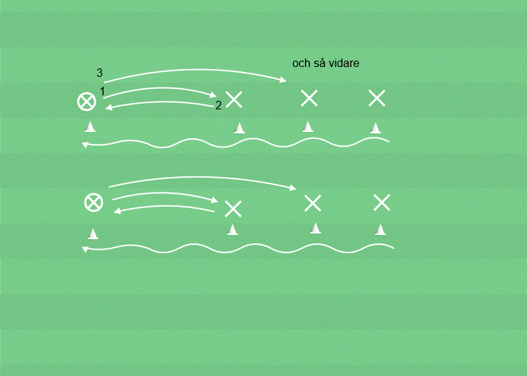 Nummer ett i varje lag sträcker upp armarna och lämnar/kastar bollen till nummer två. Nummer två böjer sig ner och rullar bollen mellan benen till nummer tre och så vidare.