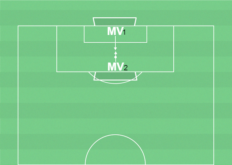 Mv1 skjuter bollen med studs rakt mot Mv2.
