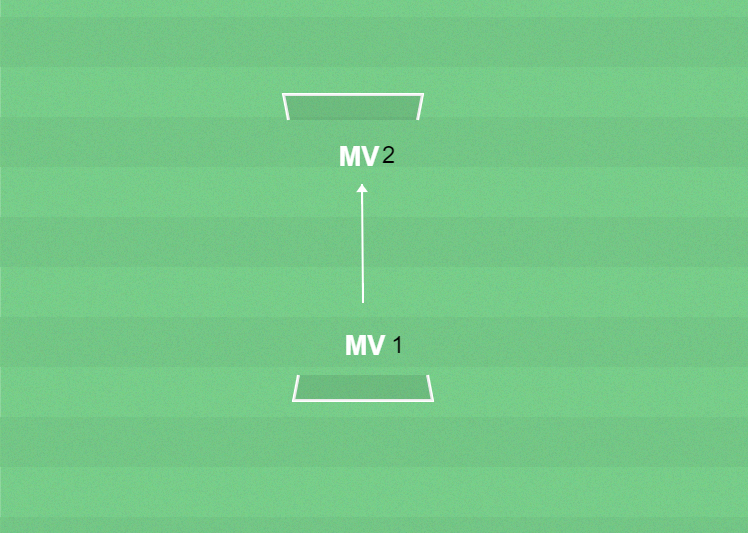 Mv1 skjuter bollen mot Mv2 som fångar bollen.