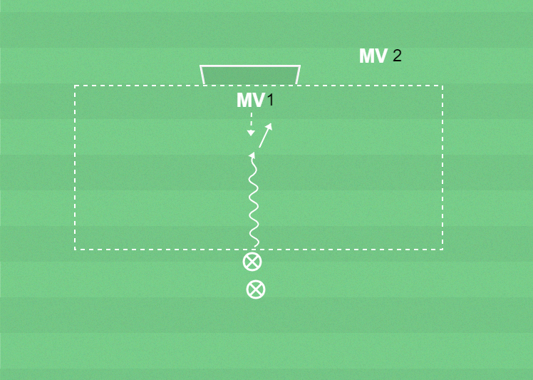 Variant: Bollhållaren försöker dribbla förbi Mv1 åt ett förutbestämt håll, och Mv1 kastar sig och bryter dribblingsförsöket.