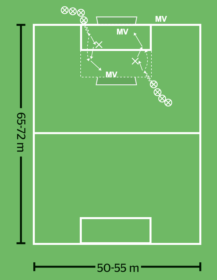 Tre målvakter, tio utespelare; yta 25 x 20 meter med två mål; bollar och koner.