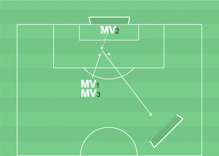 Mv3 spelar bollen som en djupledspassning mot Mv1.